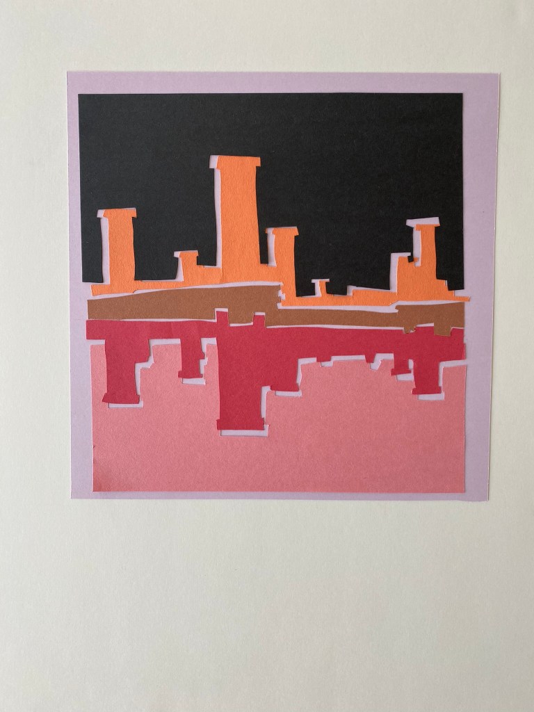 The supply list for this project is straightforward: a square photograph, construction paper, tracing paper, graphite paper, a glue stick, a pencil, a pen, and scissors. All of the collages at the top of this post were created from 1 photograph. I re-traced the shapes 4 different times picking an orientation first (landscape or portrait), and then focusing on a particular aspect of the photo, for example the reflections. The basic idea is to simplify your image into 5 different shapes that all fit together like a puzzle. You can see in the last collage, I lost count and ended up with six shapes.