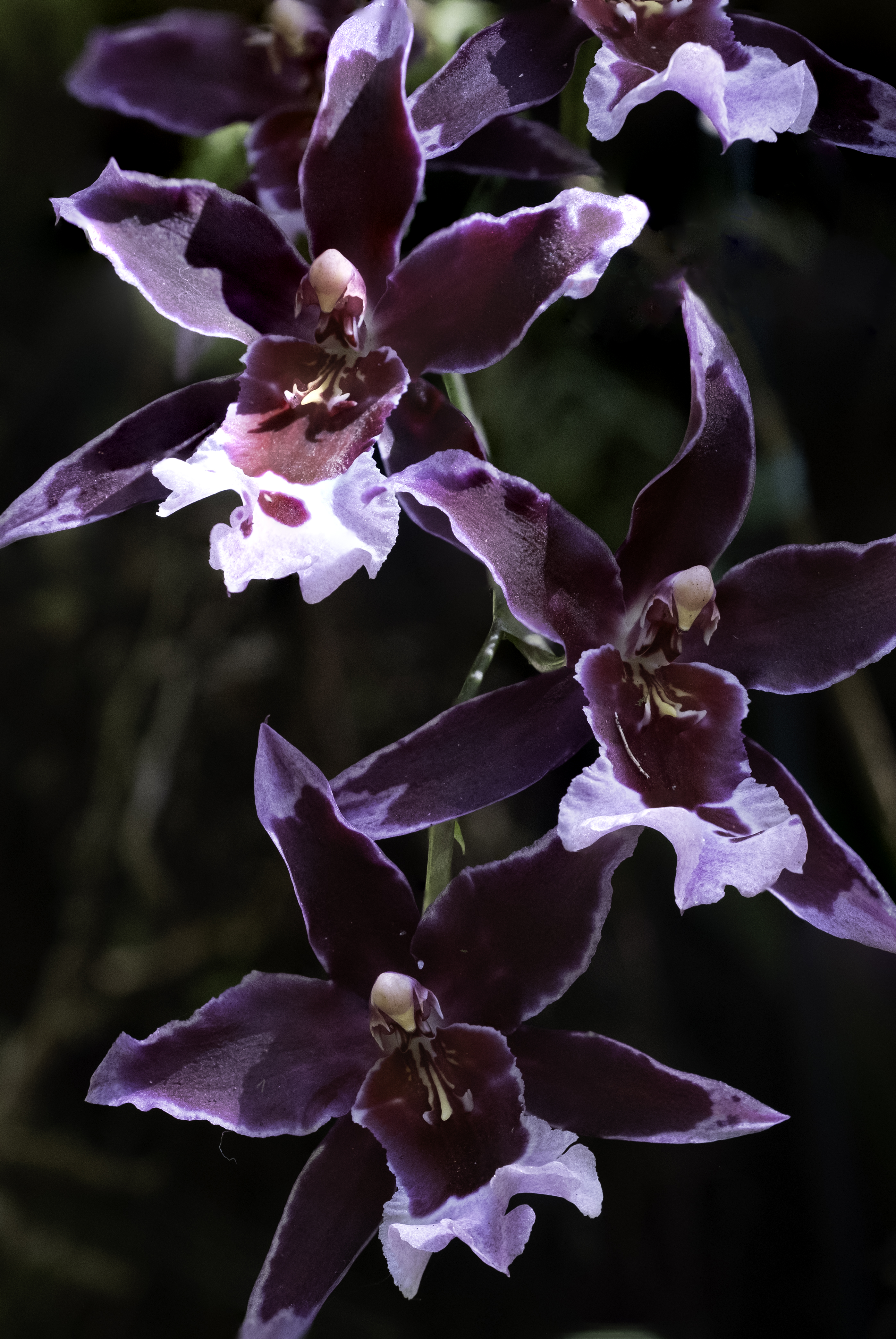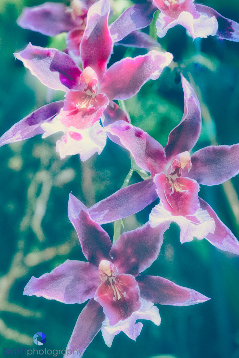 When I saw these three orchids, I started with my usual approach, macro lens with the camera on a tripod and this is what I captured (note, this image has had a creative processing treatment using Nik Color Effects Pro and a Flypaper Textures preset). You’ll notice the front sections of the first two orchids are relatively sharp and the rest of the orchids are soft. Its hard to visually land when looking at this photo. The shooting conditions also didn’t make it easy, the sun was popping in and out of clouds, the tropical breezes were blowing, and I had a few people with eye phones placing them near my shoulders.