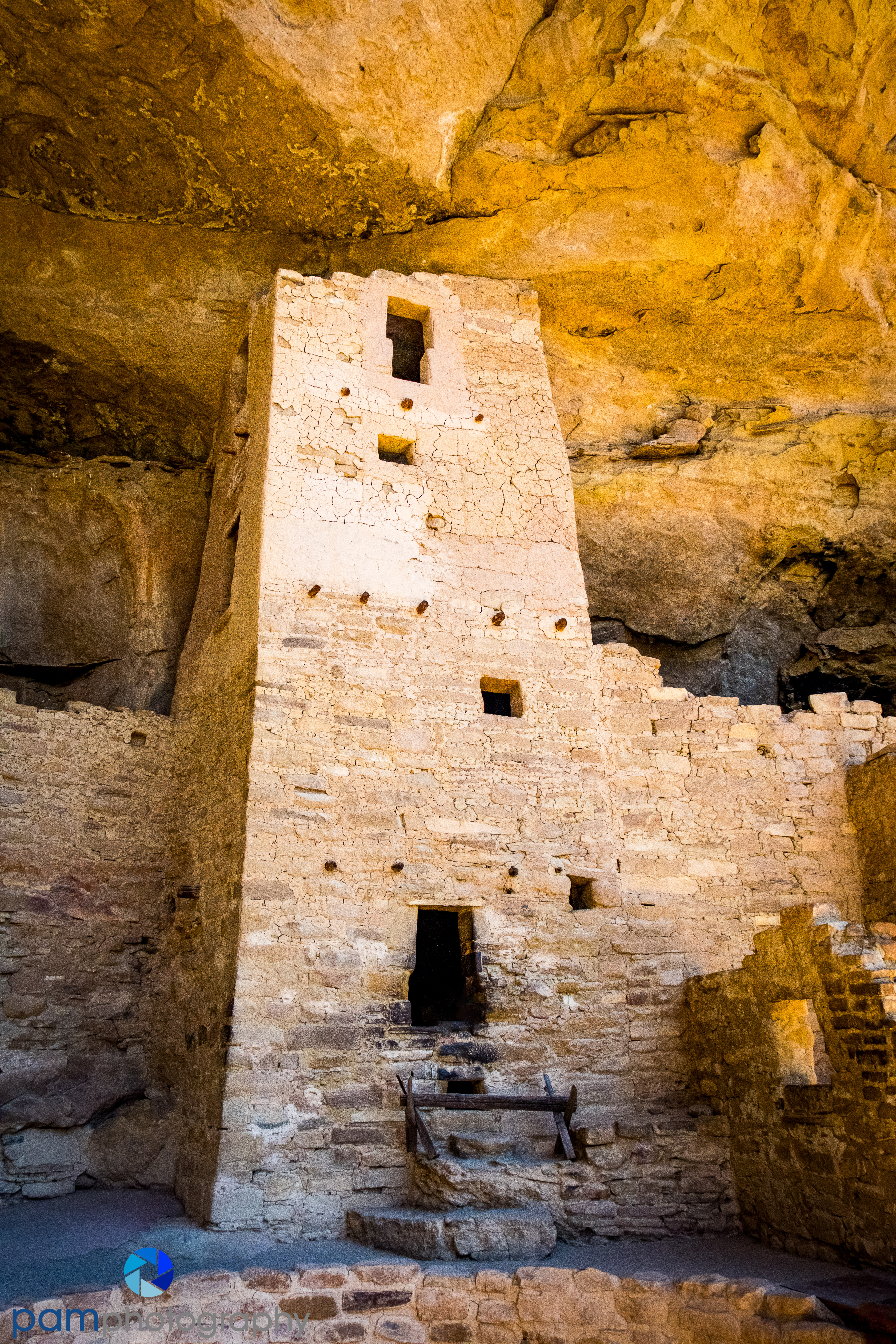 Also, on the Mesa Loop Drive is the impressive Square Tower House. On the weekends there is a Ranger-led hike to the ruins, but for most of us, the look-out will have to do. It is a very small platform. The best view is all the way to the right as you can to capture as much of the ruin as possible. This ruin is in the shade in the morning and bright sun in the afternoon. It looks best at sunset when it has a preternatural yellow glow.