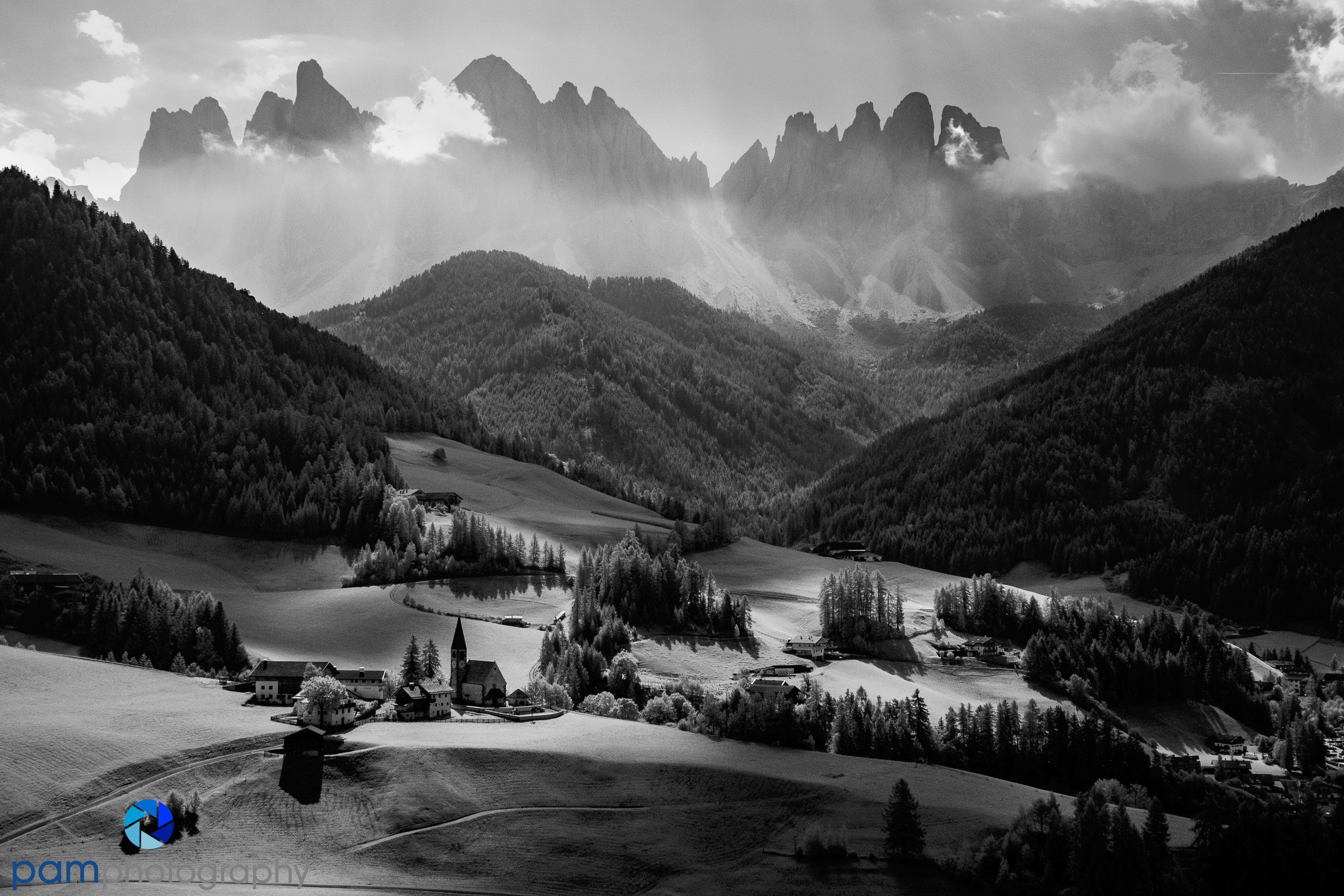 While researching locations for Italy, I came across this composition many times and I knew I wanted to make my own photo. This is the Santa Maddalena Church in the Dolomites. It was about an hour from the hotel and I knew I only had one open day to get it. After the drive and an hour hike straight up a hill which was supposed to be a 15 minute hike on level ground, we made it to our desired location and view. I made photos in color and monochrome. I like the monochrome a lot more with the shadows and the mountains peeking out from the clouds.