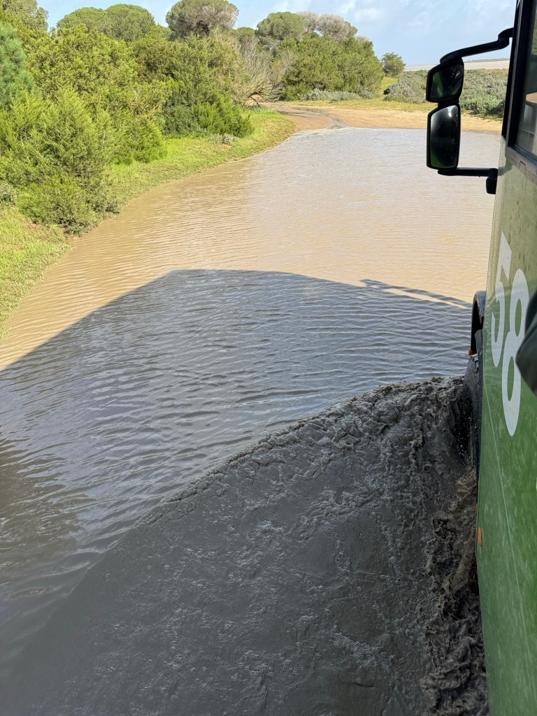 The weather once again dictated the terms of our day. Our last big hike of the hiking tour was canceled. I can’t even find a clever reason to tee up why, because you already know. We woke up to rain. Jerez de la Frontera is less than 30 minutes from the southern coast of Spain. So we piled into the van and headed there for a unique experience in one of Spain’s most unique National Parks, Doñana. And you might find this hard to believe, but the sun was shining. I think it’s some weird karma thing, when we planned to walk or hike, the sky opens up and dumps buckets. And when our unflappable tour leaders find an alternative that minimizes exposure to the elements, the sun shines.