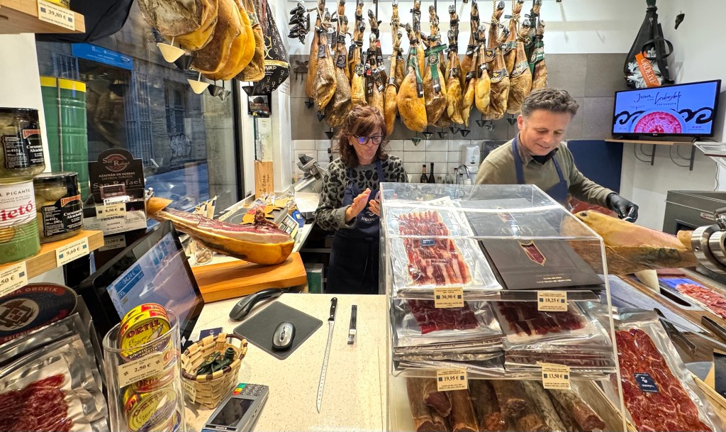 We also had an impromptu stop at a ham store owned by a very gracious couple that let us taste test (Peter’s favorite thing), black label ham vs. green label ham. I won’t go into detail about the different classifications, but here is a high-level explanation. There are two types of pigs, and depending on a pig’s parents they either get set out to pasture for a diet of 100% black acorns, or a partial diet of those highly-coveted morsels, and the rest of their diet is….well, I’m not really sure. The black label ham is the one you want, although you will pay a lot for it. By the way, I am not talking about the big round hunk of ham you see in the deli case at the Safeway. This ham comes in thin almost transparent strips, in vacuum packed plastic in the refrigerated case of a speciality market and costs an eye-popping amount for 4 ounces.