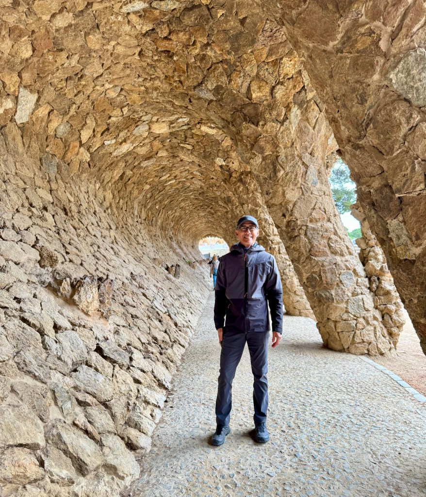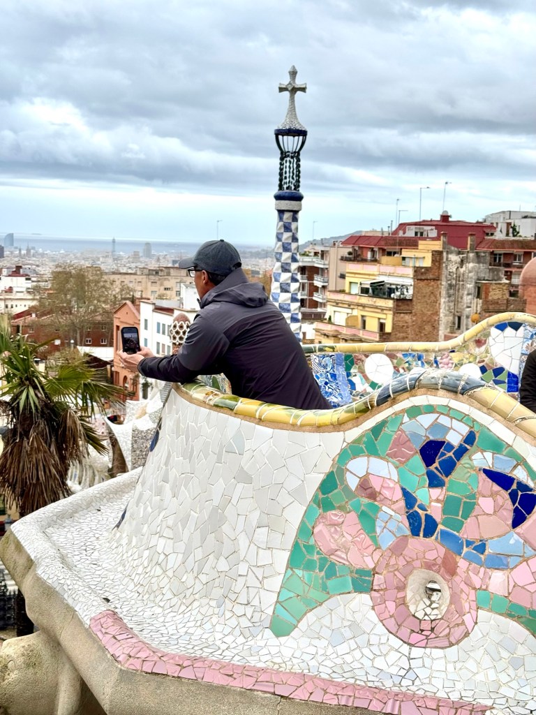 We started off in Park Guell, which is up high on a hill overlooking Barcelona. Gaudi had a rich friend, Guell, who had dreams. Guell invented corduroy (I bet you always wondered who was responsible for those hip warm winter pants.) Guell bought the land on the hill with dreams of making it like a “factory-town”, with all services in this exclusive enclave. Except it wasn’t for the working class, it would be for rich people. You know, escape from the city, walk around your neighborhood, and shop in the local market under the city square. He bought a barren hill, far away from the the hustle of the city. After the model home, and 2 other houses were built, no one was really interested, so it was eventually donated to the city as a park.