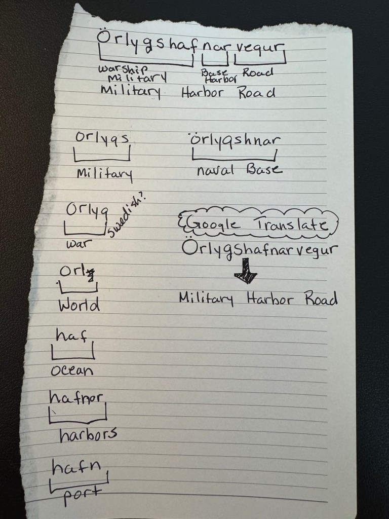 I thought I would put today’s most challenging road name into Google Translate. I started at the end of the word, deleting 1 letter at a time to try figure out what the composite words were. I was delusional. I think I ended up with one Swedish derivative, and many sub-word variations depending on what additional letters you include. Here is my worksheet for illustration.